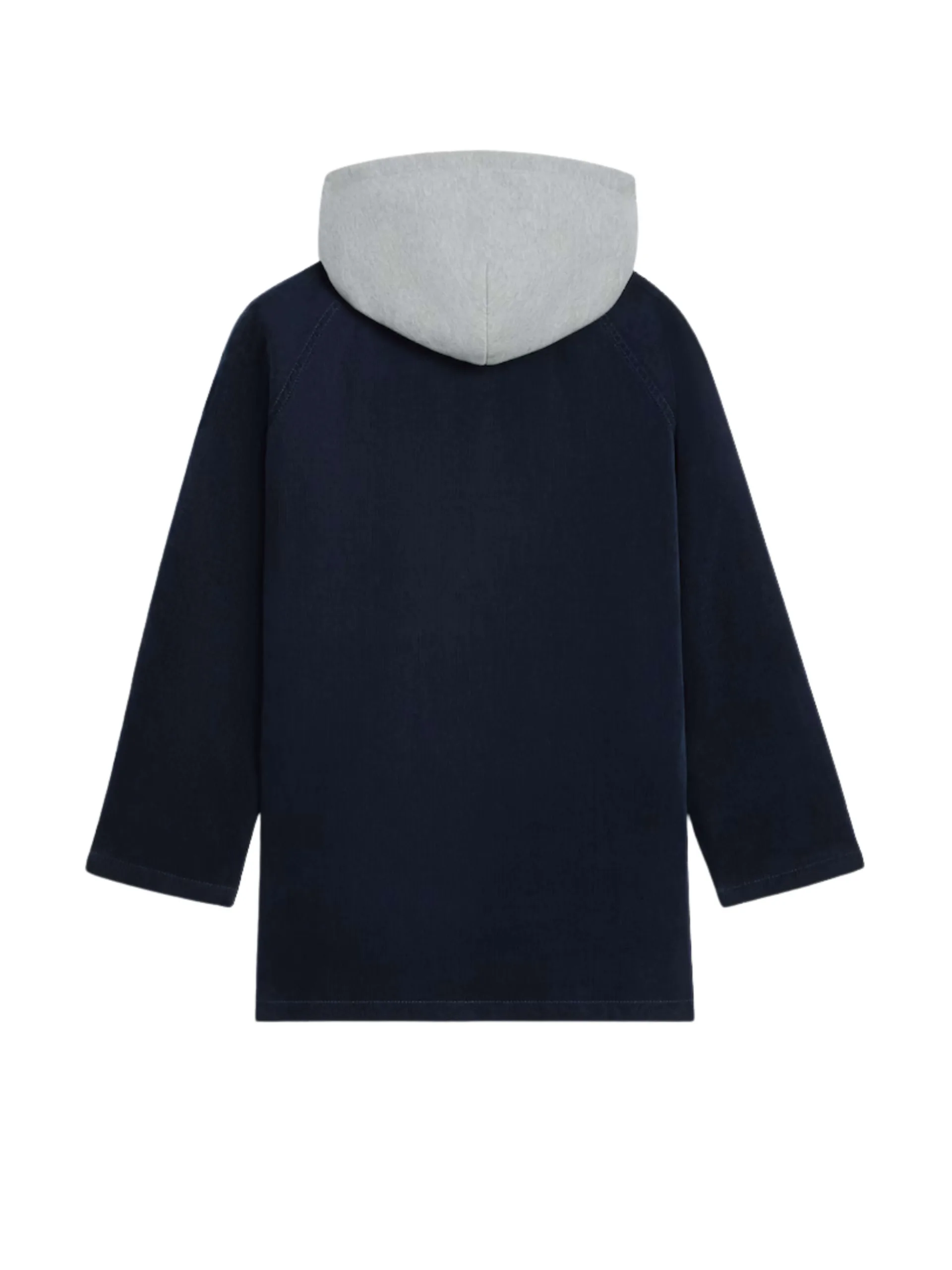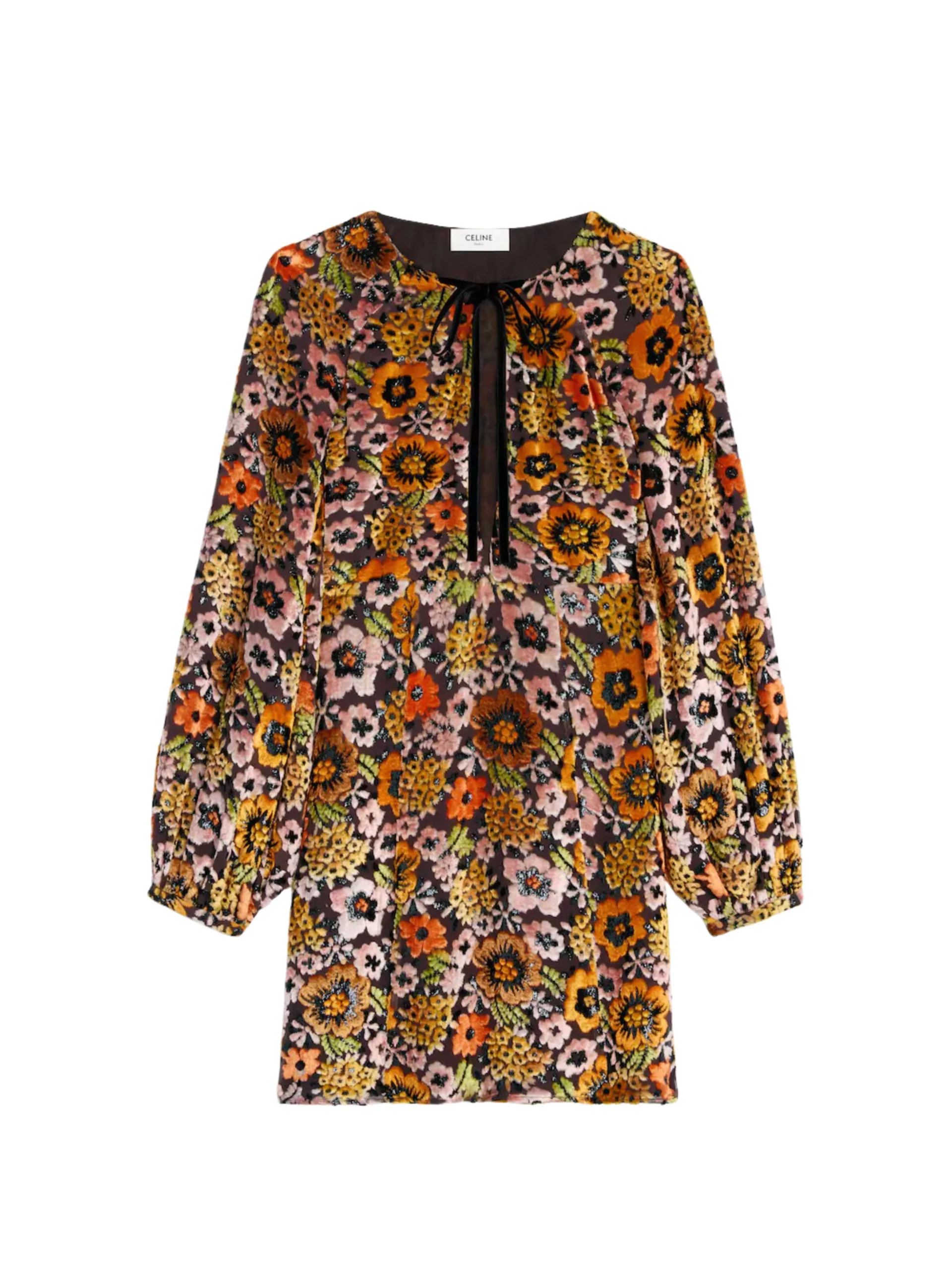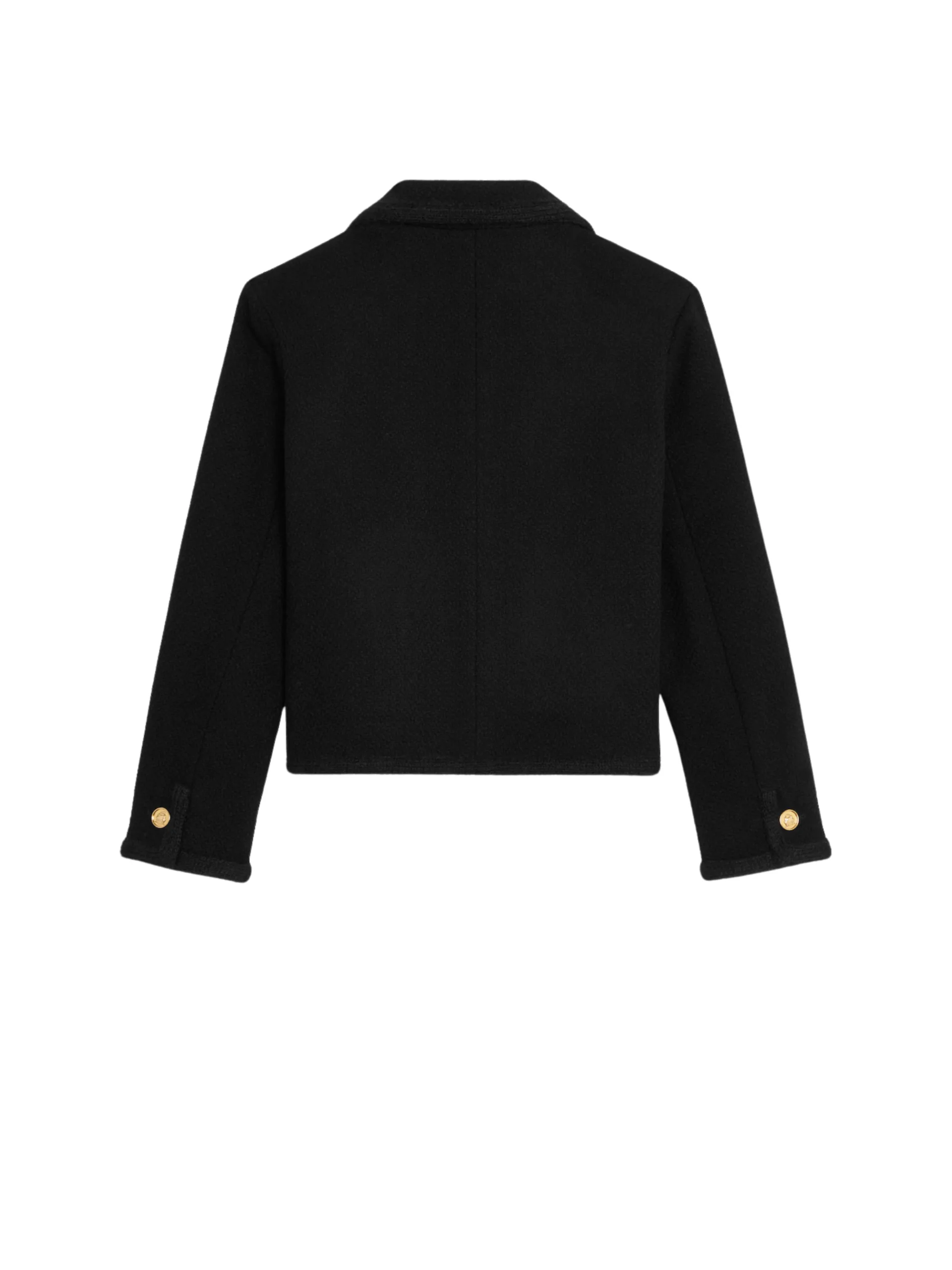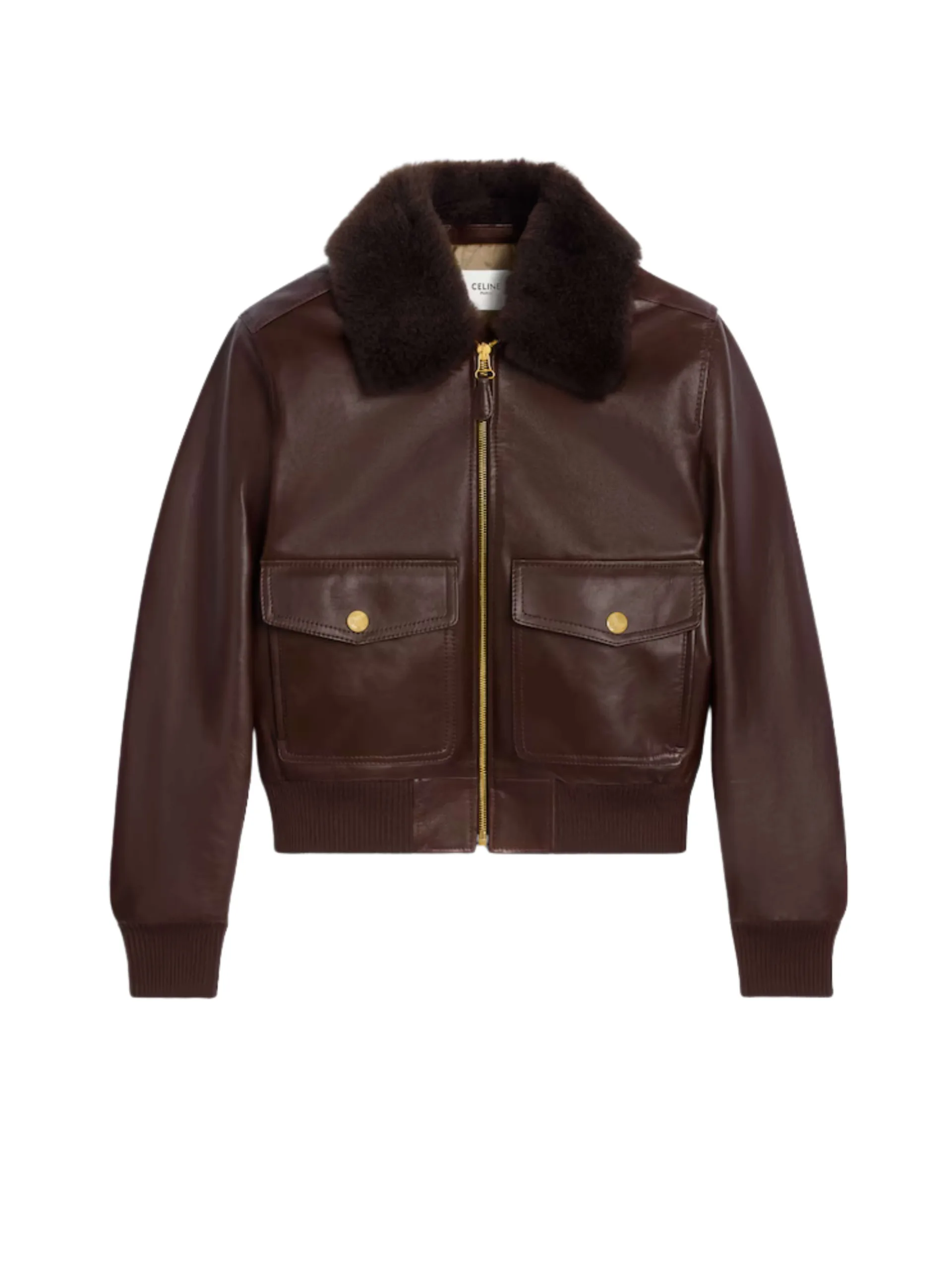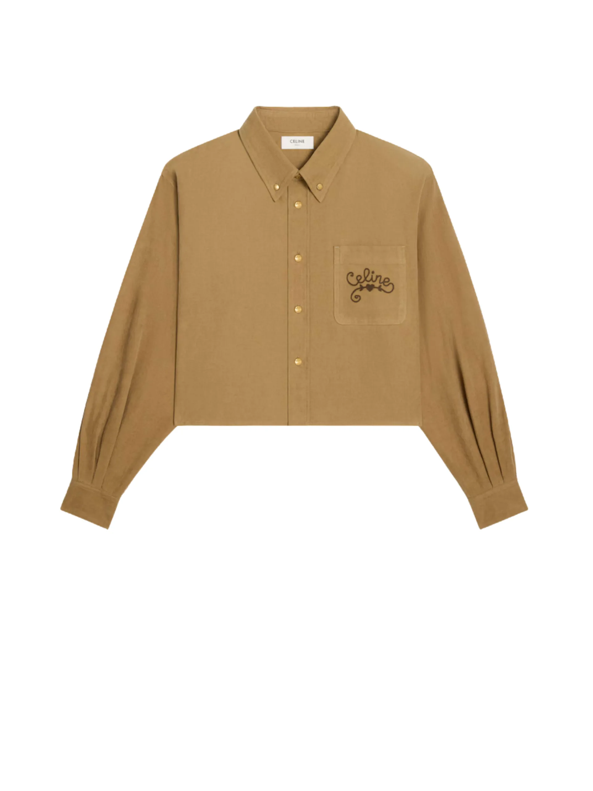 Cropped corduroy shirt with Celine embroidery, drugstore collar, patch pocket, and Triomphe button details.