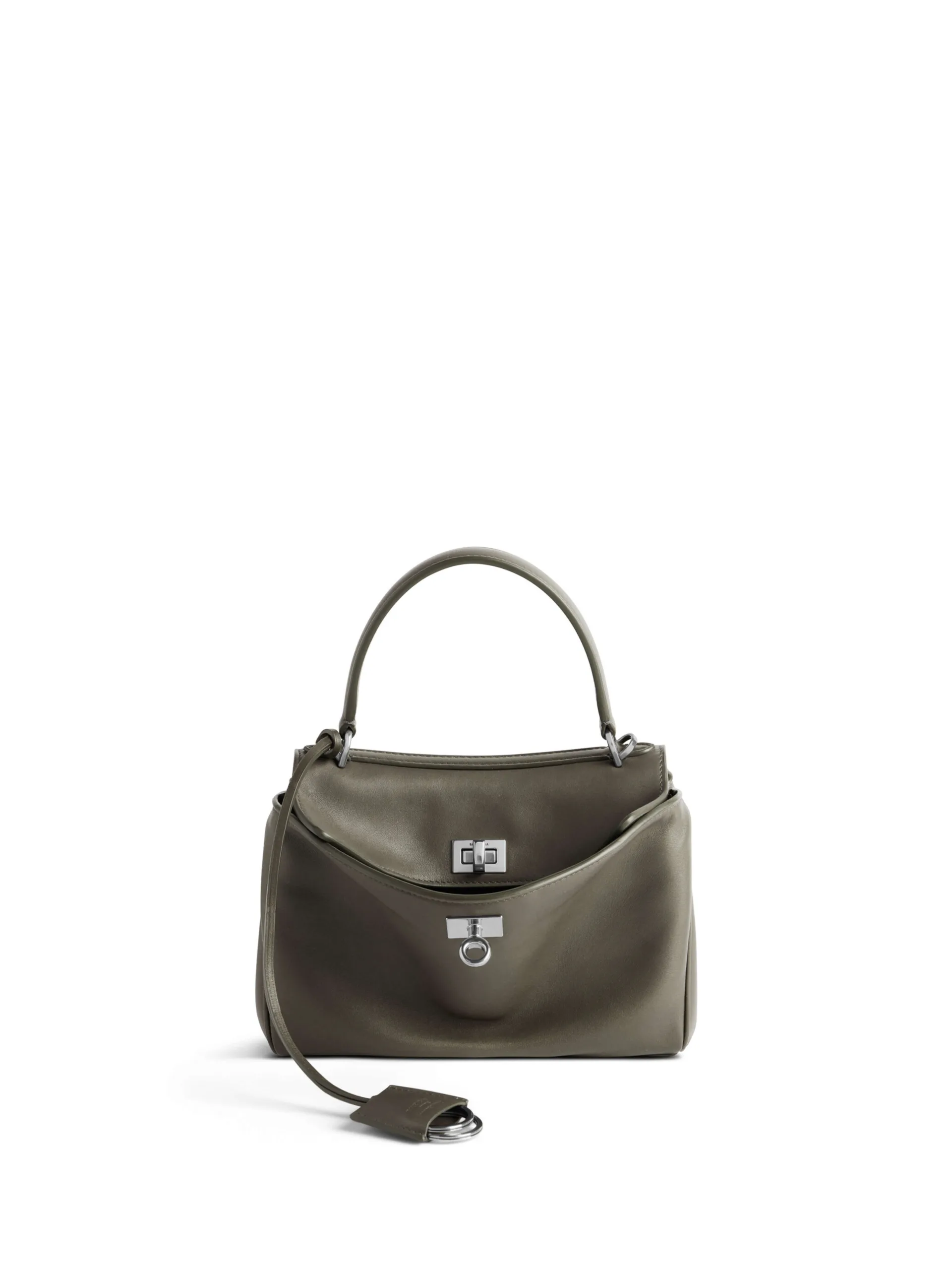 Structured top-handle bag in smooth calfskin with a removable shoulder strap and turn-lock closure.